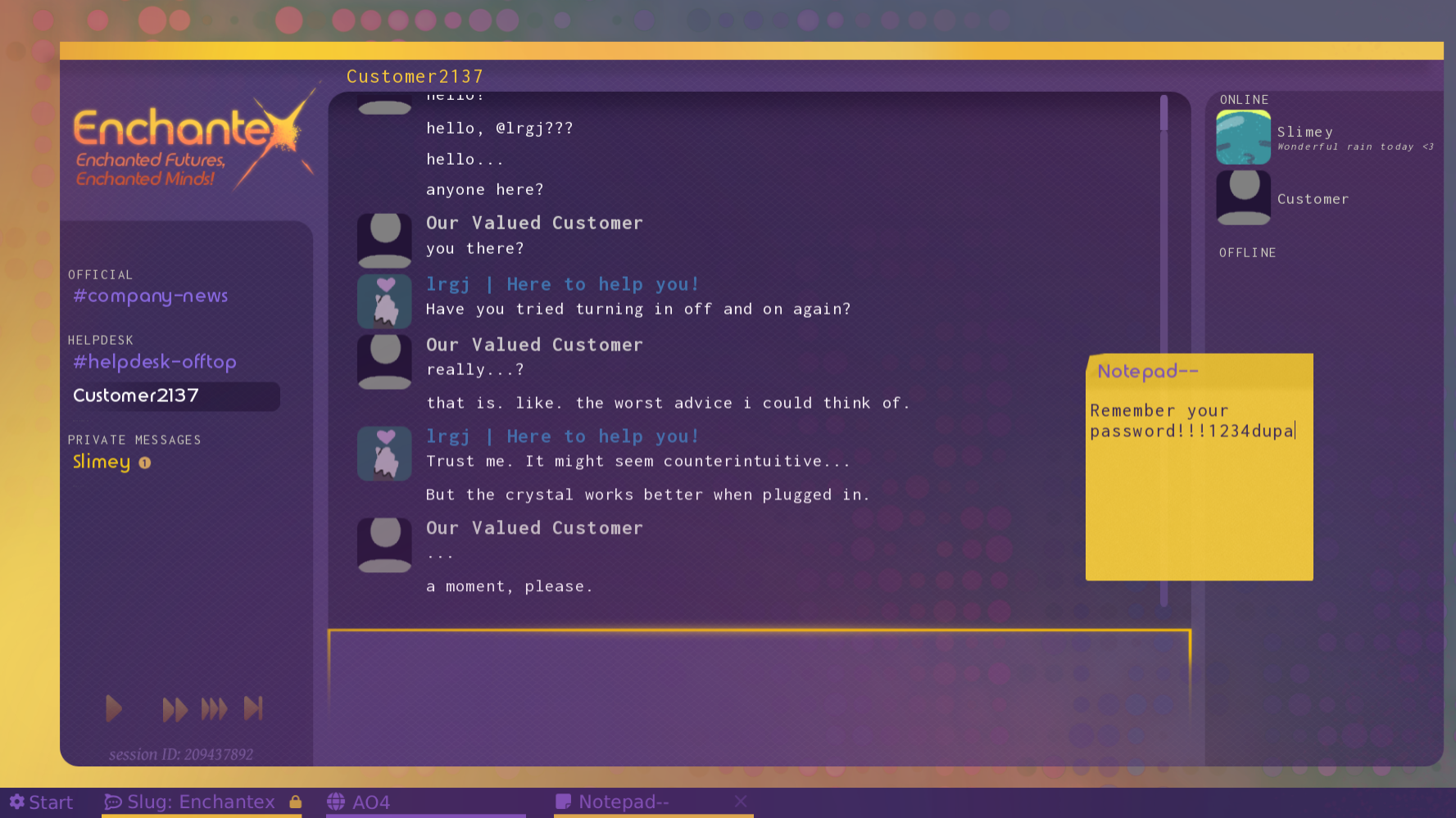 So! After spending over a year abroad, I figured out this might be a good moment to make my own game. While I am currently back home, casually looking for a "real" job, I devote most of my time to this solo visual novel. It's highly inspired by games like Blooming Panic and basically anything that robobarbie was involved in lmao. Even that chat is made using their template. Thank you thank you thank you.